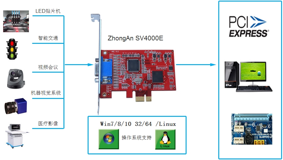 | 采用PCI-E總線接口,支持一機多卡,互不影響 標準PAL、NTSC制式彩色/黑白視頻輸入