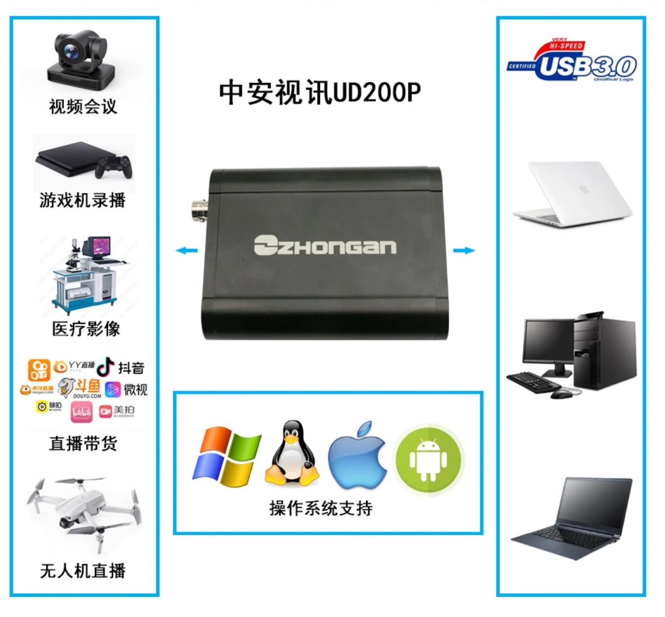 產品簡介 | UD200p一款支持全接口1080P 60HZ高清視頻采集盒,它采用了高速的USB3.0接口,同時 采用UVC無驅設計,用戶可以做到即插即用無需安裝驅動可實現1080P全實時不丟幀60幀傳輸。 支持HDMI/DVI/SDI/CVBS/SVIDEO/YPBPR和音頻輸入,滿足各種用戶的需求,真正10Bit實時 HD全分辨率高清無壓縮視頻采集,實現真正廣播級、 好萊塢電影級別的采集編輯,滿足各種全高 清攝像機實時監視采集及抓圖的需求。 我們提供完整的SDK開發包,可以選擇VisualBasic、VisualC++、Delphi,C#,Labview等多 種編程語言通過SDK進行開發。提供完整的Labview VI函數和測試demo程序,方便客戶快速 開發相關LABVIEW程序。我們還提供調用范例程序源程序及函數詳細調用說明,方客戶輕松 開發自己的應用系統;同時我們提供完善的開發技術支持,并可根據客戶要求量身定做SDK。 |